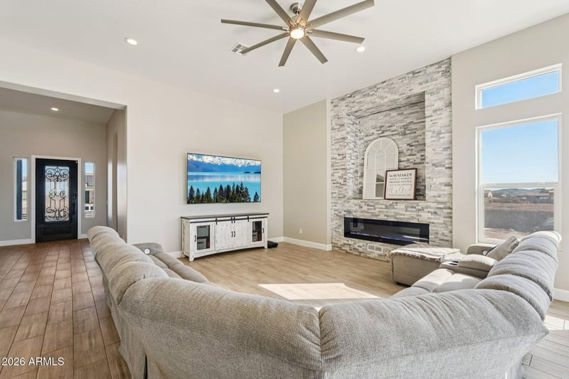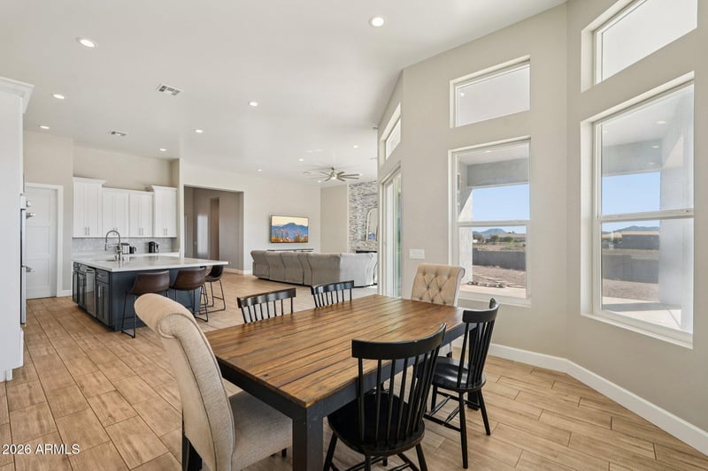 Listing details for 8512 229th Ln, Buckeye, AZ 85326 : Custom 4-bedroom, 3.5-bath home with 1100 sq ft Detached Guest House on 1+ acre with irrigation rights—horse property and NO HOA! Open floor plan with large dual-pane windows capturing White Tank, Sundance, and Estrella Mountain views. Kitchen features quartz countertops, all-wood cabinetry, walk-in pantry, new appliances, and double ovens, opening to a light-filled nook dining area. Living room includes electric fireplace with built-in entertainment wall. Spacious primary suite offers huge walk-in closet and elegant bath with dual vanities and designer lighting. Second primary bedroom with ¾ bath, plus third bedroom and fourth bedroom/den. Ceiling fans with lights throughout. Three-car garage with oversized doors (16'x8', 10'x8'). Large Yard with Synthetic Grass and Mountain Views!