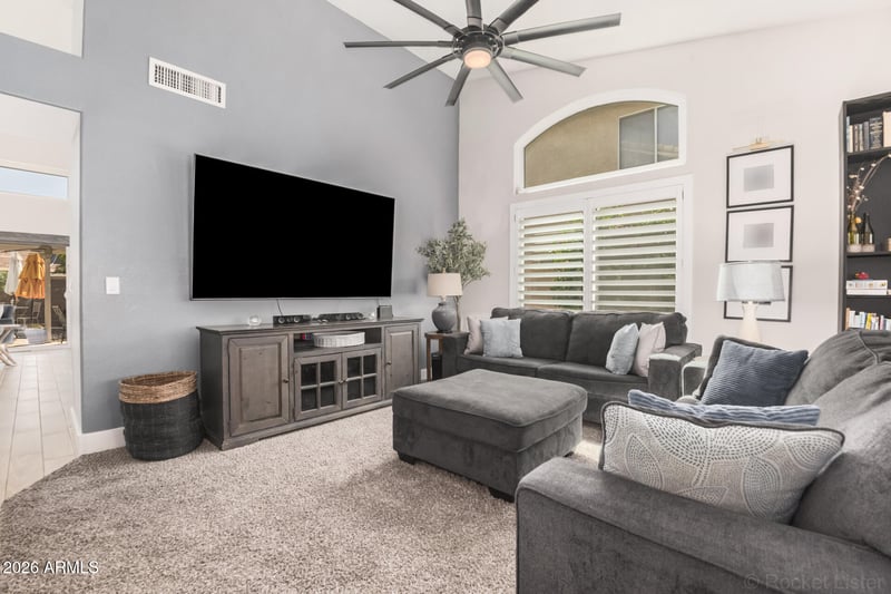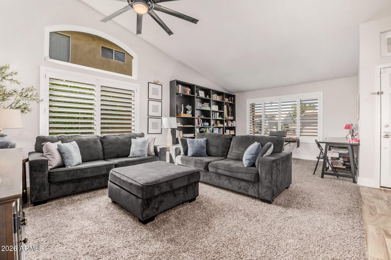 Listing details for 8517 Joan De Arc Ave, Peoria, AZ 85381 : Discover this immaculate single-story home with a sparkling pool and no HOA in Peoria! All the space you need, with 3 bedrooms plus den, 2 bathrooms, and a 3-car garage. Inside, you'll find a bright and inviting layout with soft carpeting underfoot, tile in all the right places, soaring vaulted ceilings for a feeling of openness, plantation shutters, a fireplace to add warmth, and stylish neutral colors. The gourmet kitchen is complete with ample cabinetry, tile backsplash, quartz countertops, stainless steel appliances, and an island with a breakfast bar, perfect for entertaining and quick meals. The serene main bedroom is a true retreat, offering a private bathroom with double sinks and a separate shower & tub. BRAND NEW WINDOWS THROUGHOUT! All big-ticket items are under 6 years old. Pool redone in 2025!