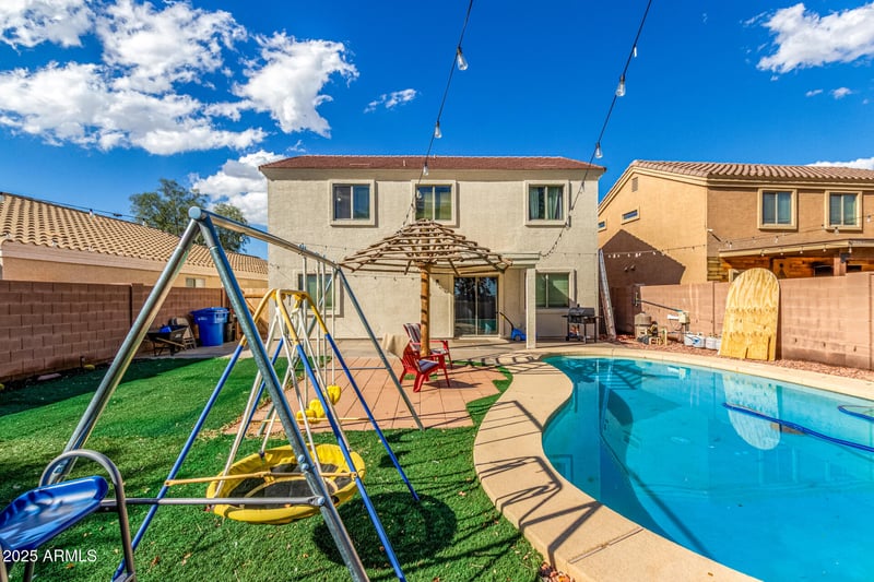 Listing details for 8517 Riley Rd, Tolleson, AZ 85353 : Charming two-story pool home is now on the market! This beauty boasts an inviting curb appeal, fresh exterior paint, a manicured landscape, and a 2-car garage. The interior showcases soaring vaulted ceilings, tile flooring, plantation shutters, and a stylish neutral palette throughout, making every space perfect for entertaining and relaxation. The well-appointed kitchen displays abundant cabinetry, ample counter space, an island, and built-in essentials for a seamless cooking experience. The sizable primary bedroom is complete with a full bathroom and a walk-in closet. The expansive backyard features a cozy covered patio, a grassy area perfect for a playground, and a sparkling pool for sunny days! What are you waiting for? Come see it before it's gone!