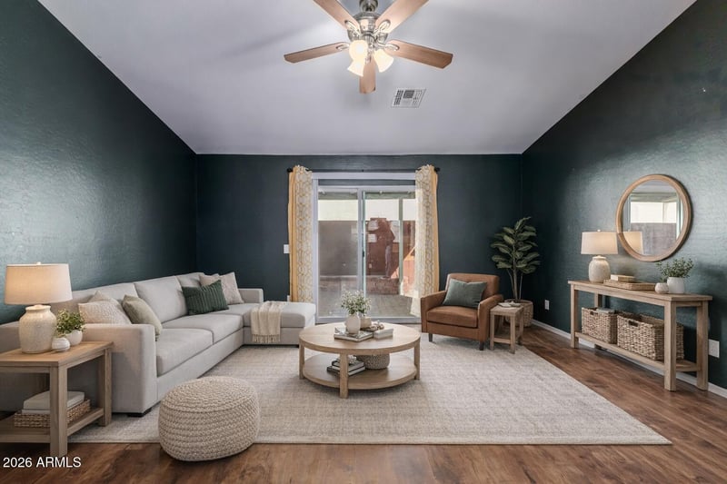 Listing details for 8520 Palm Ln #1091, Phoenix, AZ 85037 : Fall in love with this vibrant single-level unit designed for effortless living! Soaring vaulted ceilings and rich wood-look floors set the tone for a bright, welcoming living room that feels instantly like home. The kitchen is ready to impress with stainless steel appliances, warm wood cabinetry, generous counter space, a walk-in pantry, and a handy serving window to the dining area perfect for hosting and everyday ease. The main bedroom is your private retreat, complete with a bathroom featuring dual sinks and a roomy walk-in closet. Enjoy morning coffee or evening chats on the covered patio, then take a dip in the community pool. Close to parks, freeways, and local favorites. This one is a must-own!