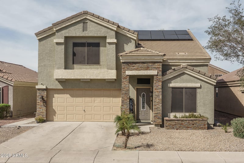 Listing details for 8526 Pioneer St, Tolleson, AZ 85353 : Welcome to this beautifully updated home offering 4 bedrooms and 2.5 baths across 2145 square feet of inviting living space. The thoughtful floor plan features a bright front living and dining area with vaulted ceilings, along with a separate family room that opens seamlessly to the upgraded kitchen. Here you will find white soft-close cabinetry with crown molding, stunning quartz countertops, a stylish tile backsplash, Miele stainless appliances, a walk-in pantry, and an island with a breakfast bar for casual dining. French doors lead to a fantastic backyard designed for both relaxation and entertaining, complete with a covered patio with ceiling fans and tile flooring, a built-in BBQ island under a covered ramada, and a stacked stone firepit with built-in seating. A staircase accented by a stacked stone feature wall leads to the bedrooms, including an oversized primary suite with a walk-in closet with built-ins and an en-suite bath featuring a dual sink vanity, designer mirror, and a tiled shower with a rain shower head and glass enclosure. Additional highlights include understair storage, luxury vinyl plank flooring, stone exterior accents, leased solar panels, and a 2-car garage with built-in cabinets.