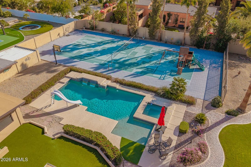 Listing details for 8551 Wood Dr, Scottsdale, AZ 85260 : Prime Scottsdale location just off the Loop 101 & Cactus offering the rare combination of an incredible 1-acre lot, an updated home, north-south exposure, and no HOA. Located in the highly desirable Sundown Manor neighborhood, this is a true ''best of Scottsdale'' setting—just minutes to the Loop 101 and approximately three blocks to a nearby city park with grassy meadows, plus bridle paths and extensive walking trails. Homes in Sundown Manor are tightly held and seldom available, making this a rare opportunity in one of North Scottsdale's most sought-after no-HOA neighborhoods. Enjoy true resort-style living with a private backyard featuring a heated sparkling pool with slide, heated spa, full-size tennis/sport court with basketball hoop, mature landscaping with fruit trees, and an expansive covered entertaining patio with fireplace, flat-screen TV, and built-in barbecue with griddle - plus a custom, all-cedar treehouse-style play structure, thoughtfully designed as a true backyard amenity. Ideal for year-round outdoor living. A standout for auto enthusiasts and hobbyists with a tandem garage and an enormous attached workshop area, along with an RV gate and 2,000+ sq ft of paver-lined additional parking and turnaround space- ideal for guests, toys, trailers, and extra vehicles. Inside, the home offers a highly functional layout with 5 bedrooms plus a large bonus/flex room and dedicated office. Open-concept living centers around the kitchen and family room with a wet bar. The kitchen features granite countertops and extensive storage, complemented by custom Bridgewood cabinetry throughout. Additional upgrades include updated flooring throughout and three A/C units. The spacious primary suite opens directly to the backyard for seamless indoor/outdoor living. Conveniently located just 20 minutes to Sky Harbor and close to Scottsdale's premier dining, golf, and amenities, as well as top-rated schools including BASIS, Notre Dame Prep, and Scottsdale Prep, with quick access to Mayo Clinic and HonorHealth Scottsdale Shea. OPEN SUNDAY JAN 25, 1-4
