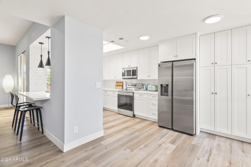 Listing details for 8634 Monterosa Ave, Scottsdale, AZ 85251 : Located in the Sands East Townhouse community, this home was recently renovated and has been has impeccably maintained. Open living, dining, and kitchen floorplan with new flooring, quartz countertops, eat-in bar top, stainless steel appliances, and custom white cabinets. Primary suite features large window and remodeled bathroom with dual sink vanity and oversized shower. Backyard includes covered patio and expanded tile patio with multiple areas to dine, lounge, and entertain. Desert front and back landscaping with new plants, lighting, and drip irrigation. Additional features include new interior paint, 2 guest bedrooms, and NEST thermostat. Home is located just minutes from Scottsdale's top resorts, shopping, golf, and restaurants.