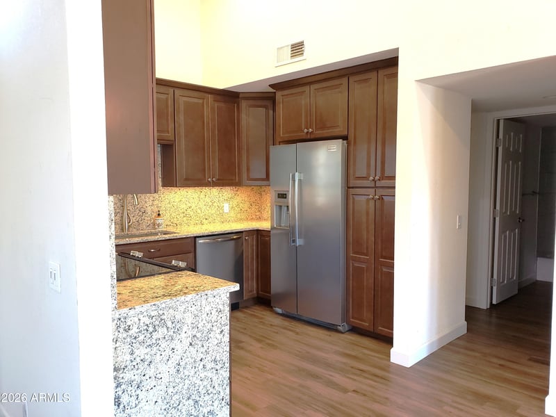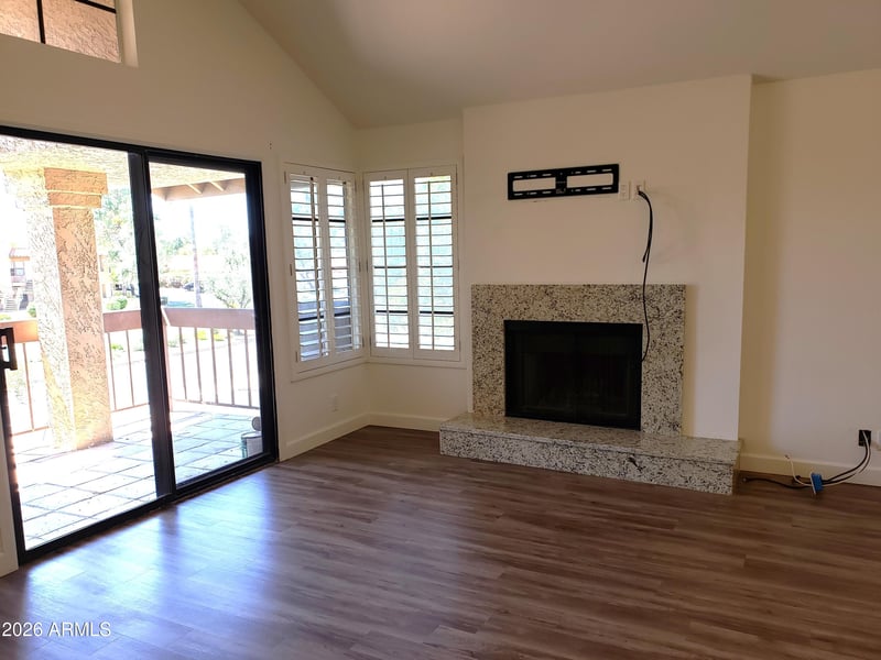 Listing details for 8700 Mountain View Rd #2033, Scottsdale, AZ 85258 : 2033 is a stunning 2 bedroom, 2 bathroom remodeled Scottsdale condo located in Sun Canyon. This beautifully updated home has high cathedral ceilings, plantation shutters with plenty of natural light, wood laminate flooring throughout all living areas with upgraded carpeting in each bedroom. Two tone neutral paint and upgraded fixtures and ceiling fans. The large open living room with wood-burning fireplace continues to the private balcony with no neighbor to the rear. The beautifully updated kitchen features granite countertops and backsplash, upgraded cabinets with crown molding, separate pantry and all stainless-steel appliances. The larger primary suite includes a walk in closet and remodeled bathroom with double sink vanity and granite countertops and tiled shower. Easy access to the Greenbelt, walking and riding path and entertainment, restaurants and state of the art medical facilities.Washing machine and dryer are included along with additional hallway storage cabinets and work area. The sparkling community pool and clubhouse offer all of the fun with none of the work. ONE CAR GARAGE INCLUDED!