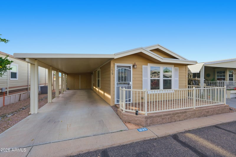 Listing details for 8700 University Dr #1629, Mesa, AZ 85207 : Welcome to this charming single-story manufactured home offering comfort and functionality. Featuring 2 bedrooms and 1 bathroom, this home includes tile and carpet flooring throughout, granite countertops, white appliances, and warm brown cabinetry that add a classic touch to the kitchen. Enjoy the convenience of a covered carport and driveway, along with a welcoming front deck perfect for relaxing or entertaining. A great opportunity for affordable living with practical features and inviting spaces.Located in the Viewpoint Golf Resort 55+ community, residents can take advantage of numerous amenities such as two golf courses, four pools, pickleball, tennis, softball, live entertainment, and over 200 clubs.
