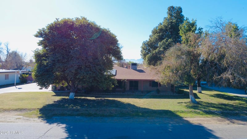 Set on nearly an acre, this 3,395 sq ft home features lush mature trees, flood irrigation, and plenty of room for horses, RVs, and outdoor living. The main home includes 4 Bedroom, 3 full baths, granite kitchen counters, fireplace, newer LVT and tile flooring, plus 2020 roof and HVAC. Attached guest quarters add 2 beds, full bath, full kitchen, vaulted great room, and fireplace. No HOA, fenced pool, and green open space in a highly desired Tolleson location.