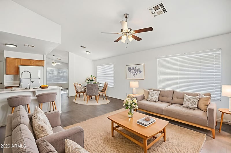 Listing details for 8708 Crescent Ave, Mesa, AZ 85208 : Inviting one-story home offering 3 bedrooms and 2 bathrooms with an open floor plan designed for comfortable living. The kitchen features a convenient bar that opens to the main living area. Enjoy a back porch overlooking a fenced backyard, perfect for relaxing or entertaining. Complete with a 2-car garage for added convenience.