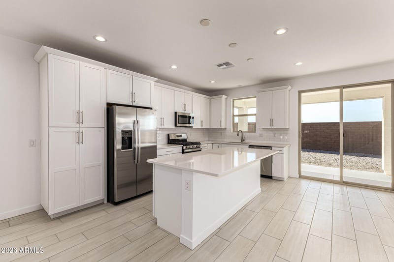 Listing details for 8716 170th Ave, Goodyear, AZ 85338 : Imagine coming home to the Pearl, where comfort meets style. Cook and connect in a modern kitchen with 42'' cabinets, GE stainless appliances (yes, the fridge too!), walk-in pantry, and a spacious island perfect for gatherings. Relax on sleek wood-look tile, with soaring 9' ceilings and 8' doors, as well as a bedroom on the first floor adding a grand feel. Upstairs, unwind in your versatile loft, ideal for movie nights or an office. Enjoy thoughtful touches like a smart lock, tankless water heater, soft water loop, extended patio, 8' garage door with opener, and fan prewires throughout. This is home! Come see it yourself.