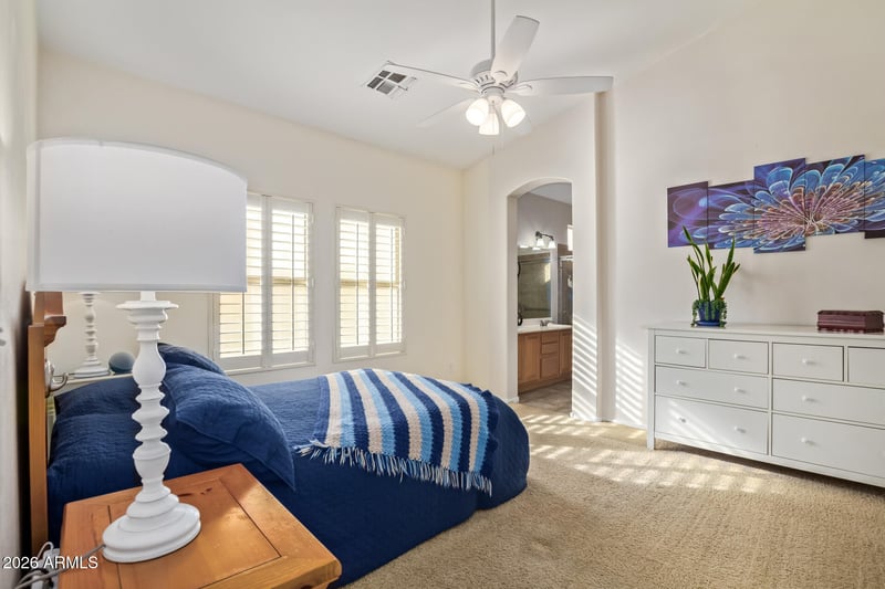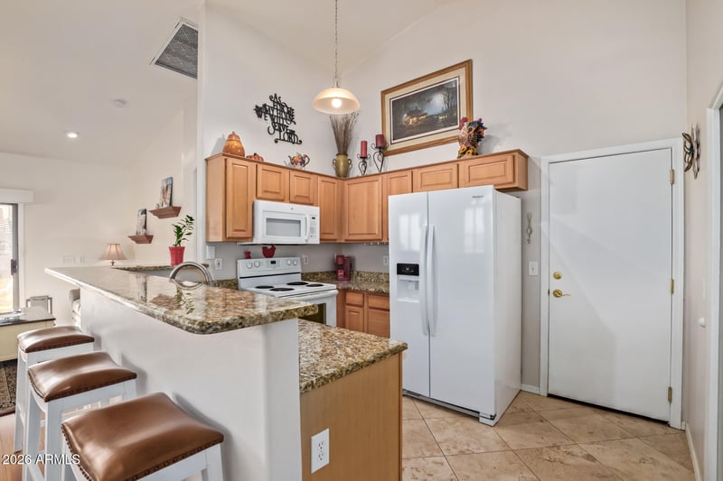 Listing details for 8739 Fairbrook St, Mesa, AZ 85207 : Charming 2 bedroom, 2 bathroom, 2 car garage single level residence nestled in sought after community of Marble Creek. Enjoy mountain views & stunning AZ sunrises & sunsets! Open, spacious split floor plan w/vaulted ceilings, bamboo floors, plantation shutters, travertine floors & granite counters. The kitchen includes raised maple cabinets, breakfast bar, & large pantry. Included is a 6 month old fridge, washer & dryer, a Trane AC unit, & a newer gas hot water heater. The primary suite includes a large walk-in closet & the bathroom has dual sinks. Beautifully landscaped backyard with a covered patio & easy maintenance synthetic grass. Soak up the views at Brown Mountain Trailhead - only steps away from the home - an excellent desert trail where you will enjoy scenic landscaping.