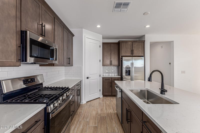 Listing details for 8740 170th Ave, Goodyear, AZ 85338 : Discover the Azure floor plan designed for modern living with stylish upgrades throughout. The gourmet kitchen boasts quartz countertops, 42'' upper cabinets, GE stainless steel appliances including a refrigerator, a walk-in pantry, and a spacious island. Enjoy 9x35 wood-look tile in main areas, 8' interior doors, a smart lock, and a tankless water heater. Additional features include a soft water loop, covered patio, garage service door, 8' garage door with opener, garage coach lights, and ceiling fan pre-wires in all bedrooms and the great room. This stunning home has it all!