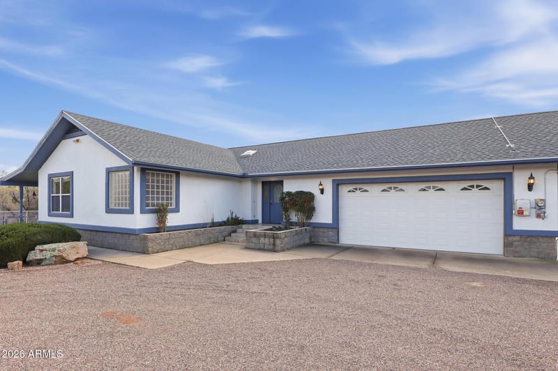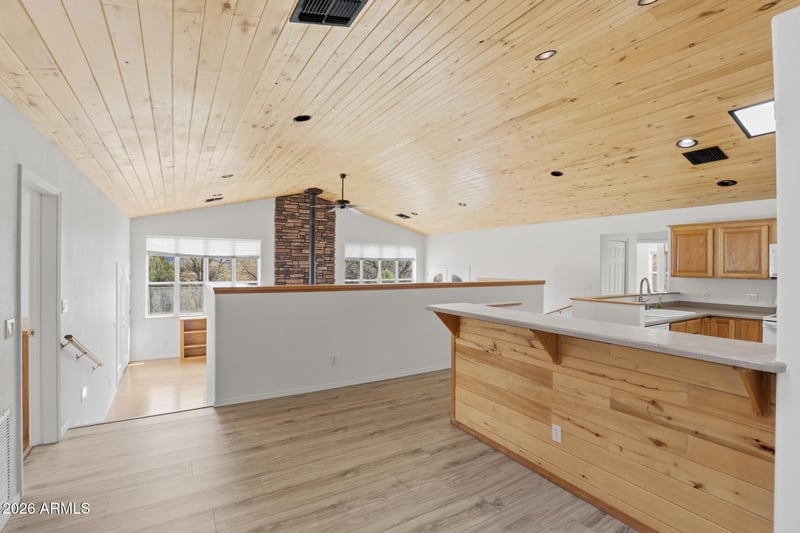 Listing details for 8780 Single Tree Ln, Payson, AZ 85541 : Nestled at the end of a quiet road and bordering the Tonto National Forest, this meticulously maintained 3-bedroom, 2-bath home offers approximately 1,940 square feet of comfortable living. Sitting on 2.1 private acres that are level, which is hard to find. Enjoy panoramic views of the open meadow and surrounding mountains, creating a serene backdrop in every direction. Inside, you'll find a thoughtfully designed split floor plan featuring hard wood and luxury vinyl plank flooring, a spacious great room with stunning tongue-and-groove ceilings, and a cozy woodstove for added warmth and ambiance. The well-appointed kitchen includes a walk-in pantry, while the primary suite offers a relaxing retreat with a separate tub and shower and large walk-in closet. Step outside to covered patios perfectly positioned for taking in both sunrise and sunset views. Seasonal Gibson Creek runs behind the property, running after storms and enhancing the natural beauty of the setting. With plenty of usable land, this property is ideal for horses, offering the rare opportunity to ride directly from your property onto the scenic trails of the national forest. Additional highlights include an owned solar system for energy efficiency, a water softener, built-in cabinetry in the garage, a large carport, and an additional parking pad for convenience. This unique property combines privacy, functionality, and scenic surroundings--perfect for those seeking a tranquil lifestyle with room to roam.