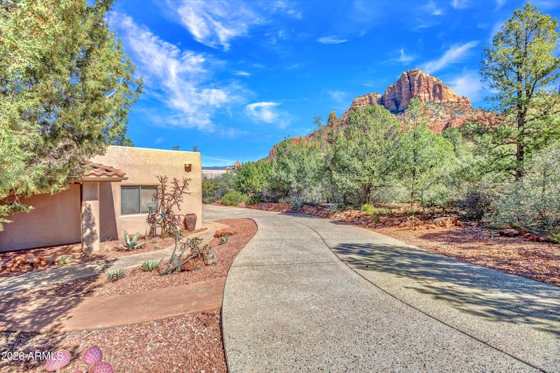 Listing details for 88 Chapel Rd, Sedona, AZ 86336 : Elephant Rock. Not a peek. Not a sliver. A full-frame, red-rock backdrop from your own massive outdoor deck complete with hot tub, sunset glow, & enough space to host everyone! This is single-level Sedona living done right. The main residence offers 3 bedrooms and 3 baths, all on one level. Easy flow. No stairs. Clean lines. Open living spaces that lead directly to that oversized deck because in Sedona, the view is the real square footage. Mornings start with coffee and red rock light.Evenings end in the hot tub under desert stars. And then there's the bonus. An attached apartment with its own entrance, kitchenette, living room, bedroom, and bath. Ideal for long-term guests, caregiver, or a long term tenant who helps offset your ownership costs. Live comfortably in the main home & let the apartment work for you. Smart, flexible, future-proof. Located in Mystic Hills, you also gain access to the community rec center, pool and spa, tennis, pickleball, and fitness room. Plus you're steps to some of Sedona's best hiking and mountain biking trails--because the lifestyle isn't optional here, it's built in.Yes, the home sits on Chapel Road.No, it doesn't feel like it.Set back off the road and surrounded by mature trees, it offers privacy that surprises you the moment you arrive.Super location.