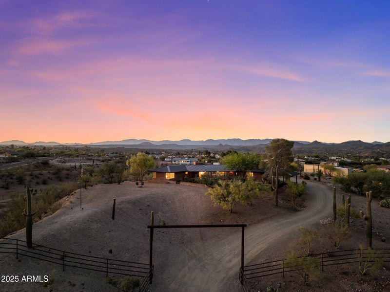 Outside, the property unfolds across the land in a way that feels purposeful rather than imposed. The green courtyard just beyond the great room creates an inviting central gathering space, and beyond it the terrain transitions into gently rolling desert and well-organized working areas. The barn and fenced spaces, with water and power in place and a natural flow between turnout areas, round pen, and riding space, function as part of the daily rhythm of the property rather than an add-on, practical and connected to the landscape.