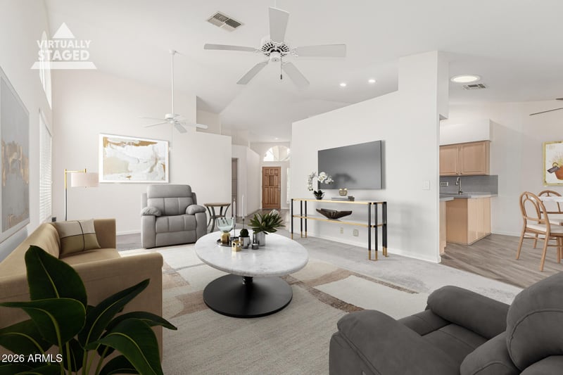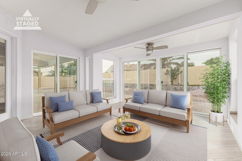 Listing details for 8954 Sequoia Dr, Peoria, AZ 85382 : Located in the sought-after 55+ Westbrook Village, this beautifully maintained home offers an ideal AZ lifestyle focused on comfort, convenience, and low-maintenance living. The split floor plan features 2 private primary suites, perfect for hosting guests or flexible living arrangements. A standout feature is the approx. 200 sq ft enclosed patio with its own heating and cooling via a mini-split system (approx. 6 yrs. old), creating a true year-round indoor-outdoor living space ideal for enjoying AZ mild winters and warmer summers. The home is filled with abundant natural light and enhanced by many upgraded windows, while the kitchen and bathrooms have updated countertops. The primary bathroom includes a spacious, updated, walk-in shower. Major systems have been thoughtfully updated including a newer AC (approx. 6 yr.), water heater (approx. 4 yr.), and roof (approx. 8 yr). Leased solar panels (approx. 5 yr) help reduce monthly electric costs. Ideally located near dining, shopping, and medical offices, this home is part of an active adult community known for its outstanding amenities, social opportunities, and relaxed desert lifestyle. Washer, dryer, and refrigerator are included, making this home move-in ready.