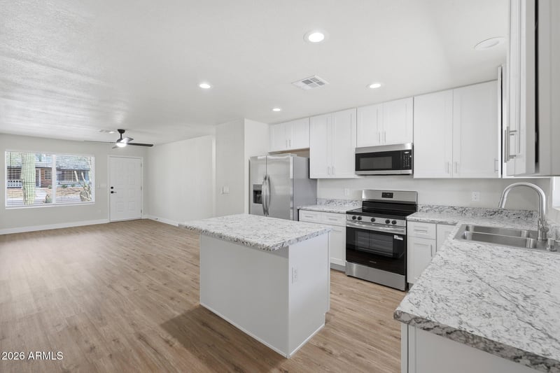 Listing details for 9001 Cinnabar Ave, Peoria, AZ 85345 : Completely reimagined and move-in ready--this fully remodeled home offers the perfect blend of modern design and effortless Arizona living. From the moment you arrive, the charming curb appeal with desert landscaping and mature cacti sets the tone. Inside, you'll find a bright, open-concept layout with all-new finishes throughout. The stunning kitchen is the centerpiece, featuring white shaker cabinetry, quartz countertops, stainless steel appliances, a spacious island, and ample storage--ideal for both everyday living and entertaining. The space flows seamlessly into the living and dining areas with new flooring, recessed lighting, and clean, contemporary touches. Both bathrooms have been beautifully updated with modern vanities, fixtures, and custom tile work, creating a fresh and cohesive feel throughout the home. Step outside to a covered patio overlooking a private backyard with a fenced pool--perfect for relaxing or hosting while enjoying Arizona's year-round sunshine. With everything done for you--new finishes, updated systems, and a turnkey feel--this home stands out as one of the best values on the market.