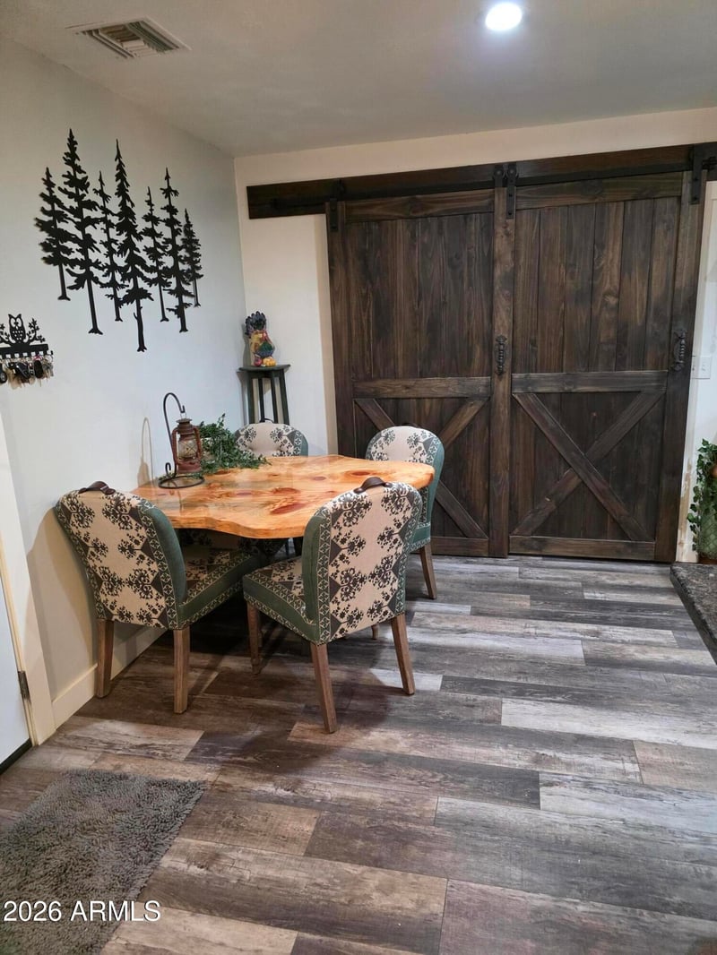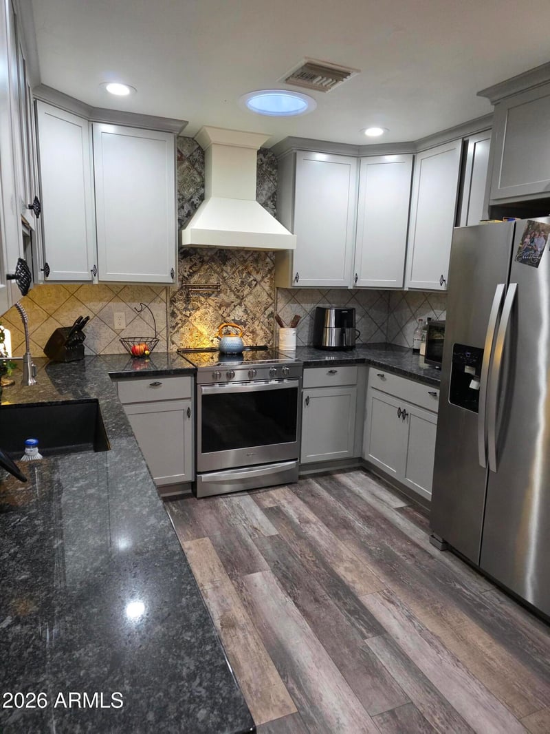 Listing details for 9009 Gary Ln, Mesa, AZ 85207 : NESTLED IN A QUIET CUL-DE-SAC, THIS AMAZING HOME IS SURROUNDED BY NATURAL BEAUTY ALLOWING FOR PEACE AND TRANQUILITY. FULL REMODEL IN JANUARY 2021, NEW VINAL WATERPROOF FLOORING FROM FLOOR AND DECOR. NEW CARPET IN BOTH BEDROOMS, PAINT INSIDE AND OUTSIDE. REMOVED OLD HVAC, INSTALLED NEW UNIT, AND NEW VENTING. NEW SHINGLE ROOF, UPGRADED GARAGE CEILING WITH 2X2 WOOD PLANKS. 18 INCHES OF NEW INSULATION ADDED. NEW DOUBLE PANE WINDOWS WITH GAS. FULL KITCHEN REMODEL! NEW CABINETS GOING TO THE CEILING WITH CROWN MOLDING. UPGRATED RANGE HOOD, PLUMBED IN POT FILER ABOVE STOVE, NEW APPLIANCES 2021 BLACK STAINLESS STEEL. GREYISH BLACK GRANITIE COUNTERTOPS. CUSTOM MOUNTED EPOXY WOOD GRAIN KITCHEN TABLE AND CHAIRS THAT ARE INCLUDED. MADE