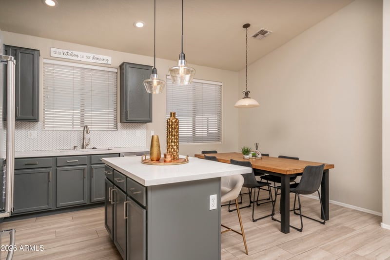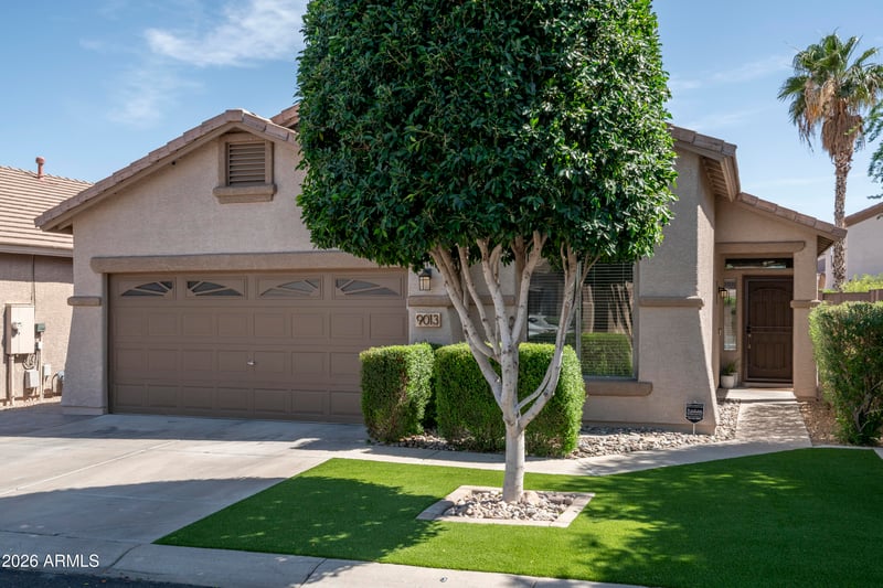 Listing details for 9013 Villa Maria Dr, Peoria, AZ 85382 : Beautiful 3-bedroom, 2 bathroom Move-In Ready Home in the Heart of Peoria! It features a spacious Great Room with soaring vaulted ceilings and a popular split-bedroom floor plan for ultimate privacy. The kitchen offers an eat-in dining area perfect for family dinners with a built-in dry bar to entertain guests. The master bedroom offers a walk-in closet and an en-suite bathroom with a separate shower and tub. Step outside to your private backyard featuring a covered patio and a durable block fence, ideal for relaxing or entertaining on the artificial turf and pavers. Some upgrades include gas tankless water heater (2025), HVAC System (2025), Polyaspartic garage floor (2025) paver driveway extension, paver patio extension, turf front and back, and automatic irrigation front and back. This home is perfectly situated near the intersection of 91st Ave and Union Hills Dr, the home offers easy access to Loop 101, shopping, and the P83 Sports complex with all new dining options. Don't miss this opportunity for a low-maintenance living in a prime West Valley location.