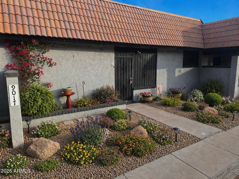 Listing details for 9017 Elm St #6, Phoenix, AZ 85037 : Great location! Close to the stadium, freeways & entertainment district. Private & inviting, ground floor, single level, 2 bedroom / 2 bath townhome. Great energy & vibes! Feel the cozy warmth of ''home'' from the moment you walk in the door. Fabulous split floor plan with the kitchen & living area in the middle and separate bedrooms & baths on each side. Terrific layout for ''roomies'' & enjoying your own private wing. Refrigerator, washer & dryer are included. Freshly painted. Special touches include plantation shutters, built-in shelves, large ceramic tile floors, ceiling fans & security doors. Arizona Room is fully screened & secure. Snowbirds can rest easy about locking & leaving, as well as those with long days at the office. Furnishings available under a separate bill of sale.