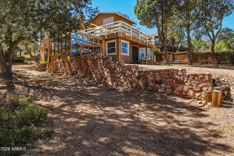 Listing details for 902 Rim View Rd, Payson, AZ 85541 : Perched to capture breathtaking Rim views, this unique multi-level home in Payson offers space, character, and versatility on a large 0.32 sized lot The main1836 sqft level features a bright, open-concept layout with a spacious kitchen, dining, and living area--perfect for gathering and entertaining. Two comfortable bedrooms and a full bathroom are conveniently located on this level, while the private primary suite is tucked away upstairs on its own level, creating a peaceful retreat. Downstairs, the fully finished 1000 sqft basement expands your living space with incredible flexibility. You'll find a large living area, wet bar, exercise room, bathroom, laundry room, and even a greenhouse--ideal for hobbies, guests, or multi-generational living. Rich wood and stonework throughout the interior add warmth and rustic charm, perfectly complementing the surrounding natural beauty. Step outside to a large back deck where you can relax and take in the stunning Rim views. Attached to the home--with its own exterior entrance--is an oversized workshop and storage area, offering endless possibilities for projects, equipment, or additional workspace. With its generous layout, unique features, and unbeatable views, this property is truly one-of-a-kind. Buyer to verify all facts and figures