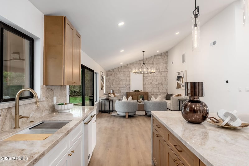 Listing details for 9025 83rd Pl, Scottsdale, AZ 85258 : Beautifully remodeled single-story home in the highly sought-after McCormick Ranch community, featuring high-end finishes, contemporary design, and a sparkling swimming pool. The completely upgraded kitchen showcases Forno appliances, two-tone shaker cabinetry, quartz countertops, and a large breakfast bar. Vaulted ceilings, a skylight, recessed lighting, and vinyl wood flooring create a bright, open flow throughout the home. The bathrooms are thoughtfully updated with premium shower systems, custom vanities, framed mirrors, and designer tile niches. Step outside to an expansive covered paver patio with a built-in adobe fireplace and dedicated seating area overlooking the sparkling pool—perfect for enjoying Arizona days and evenings year-round.