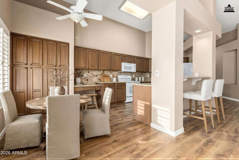 Listing details for 9041 Escuda Dr, Peoria, AZ 85382 : Welcome to this beautifully upgraded and meticulously maintained home in the highly desirable Westbrook Village, offering the perfect setting for relaxed retirement living. Features include laminate wood flooring, plantation shutters, vaulted ceilings, granite countertops, and a decorative stone backsplash. The open-concept floor plan is ideal for entertaining, while the spacious primary suite offers direct access to the covered patio and a luxurious ensuite bath with dual sinks, a custom-tiled walk-in shower with seamless glass surround, and a large walk-in closet. Expansive covered patio with drop-down shade screens. Westbrook Village amenities include two golf courses, pickleball and tennis courts, a community pool and spa, and two on-site restaurants for a true resort-style lifestyle.