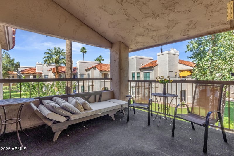 Listing details for 9125 Purdue Ave #217, Scottsdale, AZ 85258 : Vaulted ceilings, modern upgrades, and dual patio living define this updated condo in Villages 2, a rare combination of space and convenience in a peaceful, amenity-rich community. This 2-bedroom, 2-bath home spans approximately 1,189 square feet and features an open floor plan with luxury vinyl plank flooring (installed December 2024), fresh paint, and abundant natural light. The spacious living area is highlighted by a floor-to-ceiling stone fireplace and vaulted ceilings, creating an inviting atmosphere that flows seamlessly into a large dining space. The kitchen is both stylish and functional, featuring quartz countertops, stainless steel appliances, and a breakfast nook that opens to one of two private patios. Both bedrooms have direct patio access, including a generous primary suite with a reading nook, walk-in shower, and a relaxing, private feel. Additional upgrades include a newer HVAC unit (September 2025), updated lighting, ceiling fans, and recessed lighting. The home also comes fully furnished, a turnkey option for a primary residence, seasonal retreat, or investment property. Residents of Villages 2 enjoy well-maintained green spaces and an impressive list of amenities, such as 8 swimming pools, 8 spas, tennis courts, and pickleball courts. The community is ideally located near shopping, dining, entertainment, and just minutes from the Loop 101 and HonorHealth.
