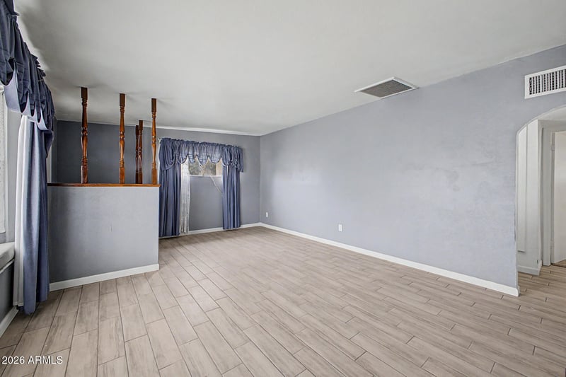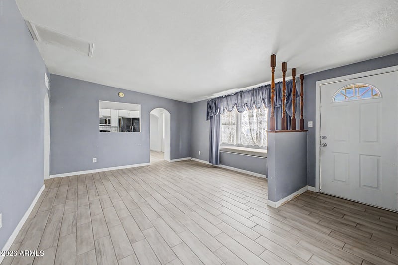 Listing details for 913 Trekell Rd, Casa Grande, AZ 85122 : This 1960-built single-family home delivers more than its square footage suggests. The floor plan opens up with a generous 20x16 living room that connects to a fully renovated kitchen featuring white shaker cabinets, stone appearing countertops, a white subway tile backsplash, and nice appliances including a dishwasher. A bonus room measuring over 250 square feet adds the kind of flexible space most homes in this price range simply do not offer. Use it as a family room, home office, gym, or fourth sleeping area. Three bedrooms include the primary with its own closet, and all bedrooms feature ceiling fans and mirrored closet doors. The updated bathroom offers a new vanity with a solid surface top. A separate laundry room keeps daily function out of the living space. Wood-look porcelain tile runs through the main areas of the home. A brand new foam roof installed in 2026 means the big-ticket item is already handled. Out back, a fully block-walled yard provides privacy and room to work with, plus a storage shed included with the property. No HOA, low taxes, and a large 8,106 square foot lot. Homes with this combination of updates, bonus space, and no HOA at this price point do not sit long.