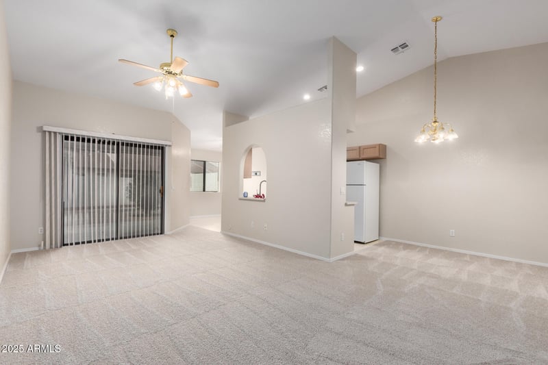 Listing details for 9144 68th Dr, Peoria, AZ 85345 : Discover this charming 2-bedroom townhome nestled in the Haciendas Del Sol community. Step inside to enjoy generous living spaces featuring brand-new carpeting, soaring vaulted ceilings that enhance the sense of openness, and fresh neutral paint throughout. The well‑appointed galley kitchen offers abundant cabinetry, ample counter space, and built‑in essentials to make everyday cooking effortless. Retreat to the spacious main suite, complete with a walk‑in closet, a private ensuite bathroom, and direct access to the backyard. Relax outdoors on the cozy covered patio—perfect for morning coffee—while enjoying a serene landscape accented by mature citrus trees. Just steps away, the community pool and spa provide the ideal spot to unwind and soak up the Arizona sunshine. We
