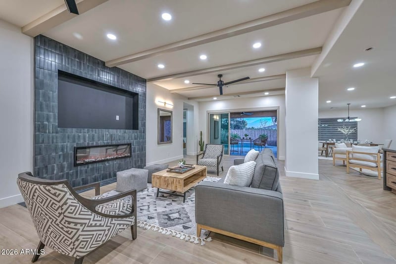 Listing details for 9151 Quail Track Dr, Peoria, AZ 85383 : Fully remodeled single-level luxury home offering 4 bed, 4.5 bath, 3 car garage, and 3,040 square feet of beautifully curated living space. Perfectly designed for today's lifestyle, this home features owned solar, RV gate with RV parking, and a private resort-style backyard with pool, pergola, built-in BBQ, and view fencing backing to a desert wash. The Great Room showcases wood beams, an entertainment wall with linear fireplace, and a 16-foot multi-slider to the covered patio. Inside, enjoy new flooring, two-tone designer cabinets, quartz countertops with waterfall island, quartz backsplash, stainless appliances, 48'' sink with 2 kitchen faucets, new lighting and fans throughout, new window treatments, and each bedroom includes an en suite remodeled bathroom and walk-in closet! The Primary Bath feels like a spa with large marble tile surround, designer lighting and mirrors, and a spacious walk-in shower with dual shower heads and body sprayers. Laundry Room has been remodeled with new base and upper cabinets and countertop space with utility sink. Garage features epoxy flooring. This home sits in the heart of North Peoria. Minutes from the "four corners," the Loop 303, and five star hiking at Westwing Mountain, Sunrise Mountain, and Eastwing Mountain! Close proximity to Fine Dining at The Trailhead and 83rd Marketplace. You are literally within a 3 mile radius from everything you could want: Fine Dining, Entertainment, Shopping, Parks, Hiking & Mountain Biking, and Freeway Access.