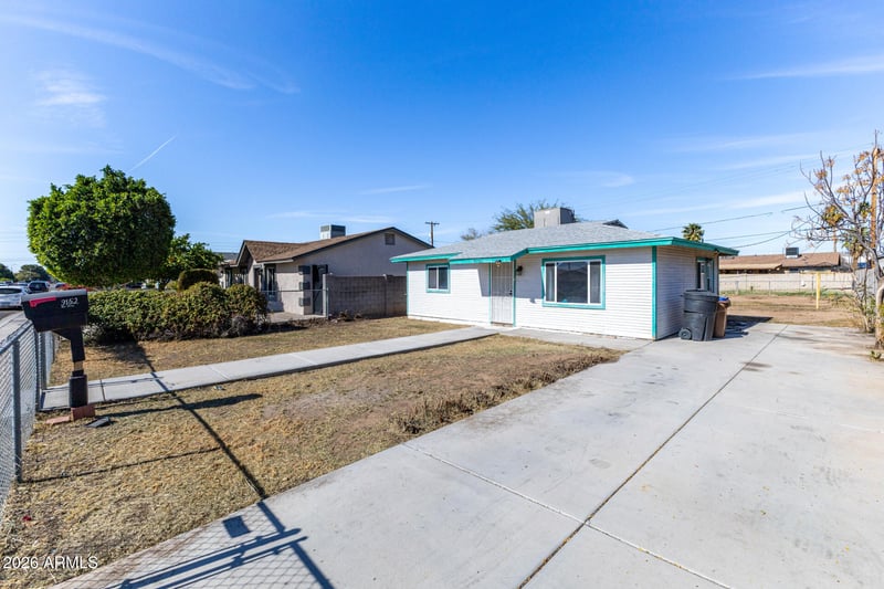 Listing details for 9152 Garfield St, Tolleson, AZ 85353 : 2-bedroom, 1 bath, single-family home on a fully fenced lot with block and chain-link fencing in downtown Tolleson. Property includes a concrete driveway along the side of the home with space for multiple vehicles and a gated front entry. Backyard features a storage shed and gated access. Interior needs your finishing touches.