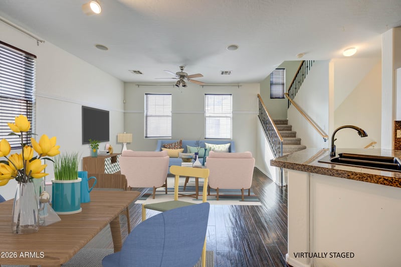 Listing details for 916 Aspen Way, Gilbert, AZ 85233 : Move-In-Ready! Detached townhome with no shared walls and a private 2-car garage—a rare find in this community. Former MODEL HOME offering 1,619 sq ft of well-designed living space with engineered wood floors, granite countertops, and stainless steel appliances (all convey). Flexible floorplan includes a ground-level study/office, ideal for work-from-home, and a spacious primary suite with built-in desk area. Crisp white walls paired with rich wood flooring and thoughtful upgrades throughout. Enjoy the convenience of condo living with the privacy of a standalone home. ** Seller will contribute up to $500 towards a home warranty on an acceptable offer'' **