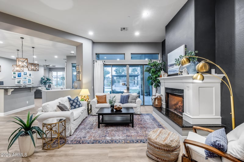 Listing details for 9187 Bajada Rd, Peoria, AZ 85383 : Updated to perfection—where luxury, space, and breathtaking views come together! This stunning 4-bedroom, 3-bath residence offers 3,985 sq ft of refined living space on an expansive 18,861 sq ft cul-de-sac lot, showcasing sweeping mountain and wash views and exceptional curb appeal with a travertine paver walkway and grand double-door entry. Inside, enjoy 12-foot ceilings throughout, a desirable split floor plan, and large picture windows that flood the home with natural light and frame the serene backyard. Beyond the four true bedrooms, the home offers multiple versatile flex spaces, including a dedicated gym room, a private office, and a thoughtfully designed laundry room with built-in desk—ideal for a home office, study area, or butler's pantry/mudroom setup. These spaces offer incredible flexibility for today's work-from-home or multi-use lifestyle. The chef's kitchen features granite slab countertops, a large breakfast bar, maple raised-panel cabinetry, a beautiful backsplash, a spacious pantry, and a butler's pantry off the formal dining area. A private guest wing with two generously sized bedrooms adds comfort and privacy, while the primary suite boasts a bay window and direct access to the covered patio. The living room also opens seamlessly to the outdoors through French sliders. The resort-style backyard is made for entertaining with a huge covered patio, synthetic grass, travertine pavers, a raised patio area, and an outdoor fireplace - all set against stunning desert and mountain views. Recent updates include a new A/C unit, EcoWater soft water system, garbage disposal (2025), full exterior repaint, and new carpet throughout (2024). Additional upgrades available - see attached list for full details. This exceptional home truly has it all.
