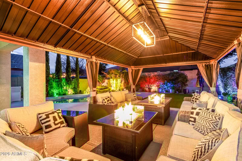 Listing details for 9220 182nd Dr, Waddell, AZ 85355 : Luxury living in this highly upgraded home in Cortessa. Designed with elevated finishes throughout, the home features upgraded flooring, designer lighting, and a sophisticated color palette. On top of the upgrades, this home also features owned solar & a heated pool. The chef's kitchen showcases refinished cabinetry w/over & above lighting, upgraded countertops, tile backsplash & SS appliances. Upstairs primary suite has vaulted ceilings, upgraded walk in shower w/multi-jet shower heads, double sinks & walk in closet. 3 more bdrs split + a loft that could be bdr 5. Outside is an entertainers dream w/large gazebo, extended decking, mature landscaping & sparkling heated salt water pool. More upgrades incl Tesla chargers & single unit washer/dryer. See the upgrades list in the docs tab!