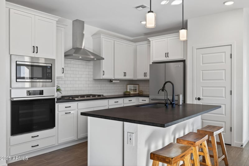 The kitchen is the heart of the home with crisp white cabinetry, black hardware, a subway tile backsplash, stainless appliances, a gas cooktop with hood, a large island with seating, and a single basin sink. R O and a water softener add everyday convenience. A bedroom and full bath on the first floor provide flexible living options, while upstairs you'll find a generous loft and plush berber carpet. The primary suite features a beautifully upgraded tile shower with sleek black accents and a dual sink vanity. Even the laundry room stands out with playful tile details.