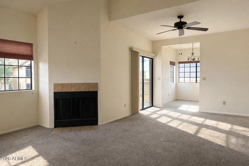 Listing details for 930 Mesa Dr #2063, Mesa, AZ 85201 : Upper-level condo in a resort-style community featuring LVP flooring in kitchen, dining, and hall, newer carpet in living areas and bedrooms, and a cozy wood-burning fireplace. Kitchen includes GE Spacemaker microwave, Whirlpool glass-top range, Kenmore refrigerator with ice maker, stainless dishwasher, upgraded lighting, and breakfast nook with chandelier. Two bedrooms with mirrored closets, two full baths with upgraded lighting, indoor laundry, and Carrier HVAC. West-facing balcony offers sunset views plus storage closet. Convenient courtyard access and community amenities nearby. Ask your agent for the full photo package and 3D tour.