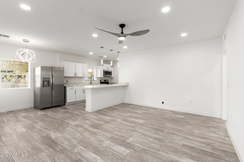 Listing details for 9309 Adams St, Tolleson, AZ 85353 : Home, sweet home! This thoughtfully upgraded 3-bedroom property welcomes you w/ an extended driveway for ample open parking, pristine artificial turf, & stylish pavers. You'll be delighted by the renovated open layout w/ high ceilings, recessed lighting throughout, a soothing palette, & attractive wood-look flooring. The impeccable kitchen comes w/ quartz counters, white shaker cabinets, chic pendant lighting, stainless steel appliances, & a peninsula w/ a breakfast bar for casual meals. The primary bedroom includes a private bathroom for added comfort. You'll also find a detached guest house, perfect for visiting loved ones or a rental opportunity. The sizeable backyard includes a spacious patio, an RV gate leading to the alley, & ample space for outdoor gatherings. Make this gem yours