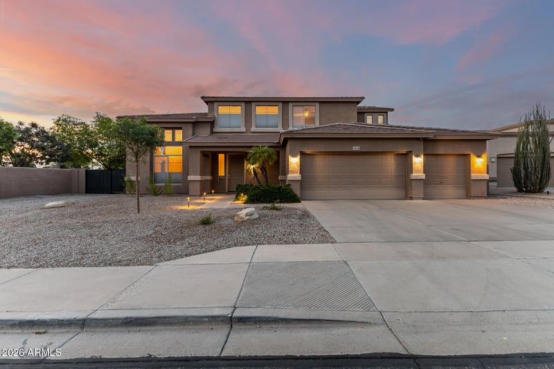 Listing details for 9348 Milagro Ave, Mesa, AZ 85209 : Welcome to this impressive 3,269 sq ft home in the desirable August Ranch community, offering 4 bedrooms plus a den, 2.5 bathrooms, a 3-car garage, and an RV gate, perfectly blending space, style, and functionality. Situated on a very private corner lot with only one single-story neighbor, this home offers both privacy and comfort. From the moment you enter, you're greeted by a grand staircase and a light-filled formal dining room, setting the tone for the home's elegant design. The open kitchen and great room create a seamless flow, ideal for entertaining, with large windows that beautifully frame the backyard and fill the space with natural light. The kitchen features granite countertops, a large island with ample seating, stainless steel appliances including a gas stove, two-tone... cabinetry with brushed nickel hardware, a tiled backsplash, and a spacious pantry. A stunning 17-foot panoramic folding door opens to the patio, creating true indoor-outdoor living. The expansive primary suite offers a private retreat with an ensuite bathroom featuring a separate soaking tub and shower, dual-sink vanity, and a walk-in closet. The den on the lower level, complete with dual door entry and wood flooring, provides a perfect space for a home office or flex room. Additional highlights include a laundry room with built-in cabinets and an owned alarm system. Step outside to your own resort-style backyard oasis, complete with a heated Pebble Tec pool, spa, lush turf, covered patio, and accent lighting, creating the perfect setting for relaxing or entertaining. This home offers exceptional indoor and outdoor living in a highly sought-after community.