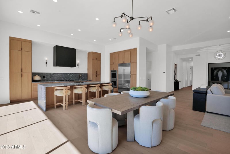 Listing details for 9359 Cavalry Dr, Scottsdale, AZ 85262 : Stunning NEW design collaboration from Dettaglio Interior Design and Sustain Scape in Legend Trail Golf Community. This gorgeous residence shows new on a spacious golf course lot, offering the full package for relaxation, entertainment, and luxury living. The main living space is adorned with 20 foot multi sliding door that creates an uninterrupted connection between a home's interior and stunning desert setting. Three ensuite bedrooms plus a Den and half bath are bathed in natural light and adorned with sleek finishes. Step inside to discover an exquisitely designed interior, complete with elegant wood flooring that extends throughout the home. Versatile, open and split layout features a spacious main living space. The master suite features a long gorgeous vanity, walk in shower, (MORE) soaking tub, and two walk in closets. The two guest wing bedrooms are each en-suite with beautifully designed tiles and fixtures. The den is a seamless addition to the family room with lovely steel doors. Prepare to be amazed by the kitchen masterpiece where every detail has been meticulously crafted, like the quartzite backsplash, lengthy quartzite island with seating, Natural oak cabinets and professional-grade stainless steel appliances including gas range. The large renovated pool and heated spa are private, with views. The exterior space is perfect for entertaining, with an open layout, covered patio, and ample pool deck space and gorgeous desert landscapes. Don't miss the opportunity to own this exceptional piece of real estate in one of the most desirable neighborhoods in North Scottsdale. Residents of Legend Trail enjoy access to world-class amenities, including championship golf, sparkling pools, a modern fitness center, tennis and pickleball courts, community center and scenic walking trails. The spacious three-car garage offers ample storage and convenience, perfectly complementing the home's thoughtful design. Virtually everything has been replaced/upgraded offering the benefits new construction in an established neighborhood.