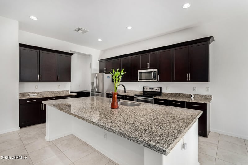 Listing details for 9383 Via Del Sol Dr, Peoria, AZ 85383 : This beautiful 4-bedroom home awaits you in the desirable Camino A Lago, with a manicured landscape with pavers, a rare 3-car garage, and RV gate, which add to the charming curb appeal. Inside, you'll find spacious living areas with tile flooring, tray ceilings with recessed lighting, abundant natural light, and neutral tones throughout. Incredible open & interactive layout, kitchen boasts espresso cabinets with crown molding, granite countertops, stainless steel essentials, and an island with a breakfast bar. The serene master oversized bedroom hosts an ensuite with double sinks and a separate shower & tub, as well as a walk-in closet. The den is ideal for an office. Out back, you'll have a cozy covered patio perfect for morning coffee, even on a hot summer morning and a lush grass area.