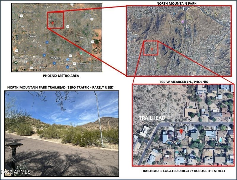 Listing details for 939 Mercer Ln, Phoenix, AZ 85029 : see supplemental remarks section North Central Phoenix - Rare Block-Built Opportunity with 360° Views & Trailhead Access! Prime North Central location directly across the street from the North Mountain Park trailhead - step out your door and hit the trails in one of Phoenix's premier mountain preserves! This solid block-constructed home enjoys breathtaking 360-degree panoramic views of the surrounding mountains and city lights, all from a quiet, peaceful neighborhood surrounded by million-dollar-plus homes. Standout features include: Super cool diving pool - perfect for relaxation or adding instant appeal Large lot with dedicated RV parking space Backyard suitable size for garden vegetables, chickens and goats Rare solid block construction - durable, timeless, and built to last Garage plans + complete with draft blueprint drawings already in hand for a second-story addition (expand now and capture serious upside) Excellent positioning next to high-end neighboring properties - tremendous potential to rebuild bigger and better Living next to a trailhead means stepping out your door and instantly accessing miles of hiking and biking trailsno driving, no parking hassles, just pure adventure right at your doorstep. Enjoy daily sunrise or sunset walks, spontaneous evening rides, or weekend-long explorations without ever leaving your neighborhood. The proximity to nature boosts physical health with effortless exercise, reduces stress through easy access to fresh air and scenic views, and adds a premium lifestyle factor that's hard to find in the city. Properties bordering trailheads often hold strong value and appeal to active buyers, as the convenience of endless outdoor recreation becomes a daily reality rather than an occasional outing. Whether you're training for a race, walking the dog, or simply unwinding after work, having miles of trails literally across the street transforms everyday living into something extraordinary. This is a true diamond in the rough with strong bones and incredible location. The home needs a new roof (seller offering $15,000 roofing credit at closing or scheduled replacement) and mostly cosmetic updates, but the payoff for the right buyer or investor will be substantialespecially with the trailhead access, views, lot size, and proximity to luxury homes. Sold strictly as-is. May not appraise at list price due to condition. Attention Investors & Visionary Buyers: No blind offers, please. Bring your contractor, your vision, and your best offer, this is a rare chance to transform a well-located property in one of Phoenix's most desirable areas. Owner/Agent - Arizona licensed real estate agent. Don't miss this North Central gem with trailhead access, endless views, and real potential.
