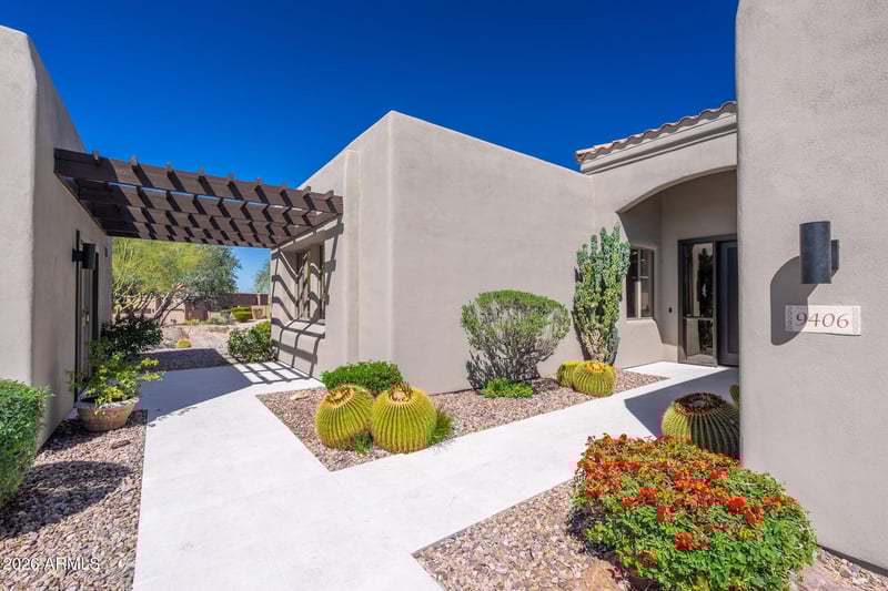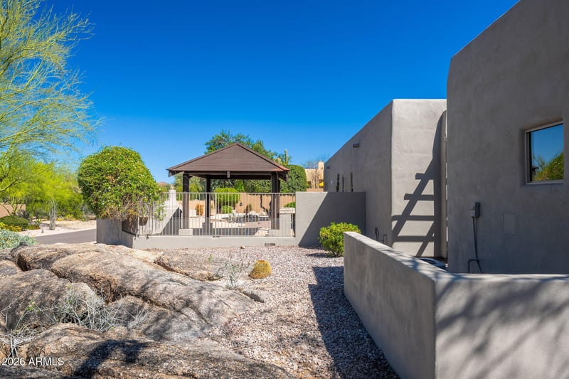 Listing details for 9406 Gamble Ln, Scottsdale, AZ 85262 : Discover high-end living in this beautifully remodeled single-story home located in the desirable Skyline Estates at Troon North community, featuring a resort-style backyard complete with SWIMMING POOL, SPA, and detached CASITA. The main living area showcases elevated ceilings and abundant natural light, with a floor-to-ceiling tiled fireplace serving as the focal point. The upgraded kitchen features brand-new Forno appliances, two-tone shaker cabinetry, quartz countertops, and a breakfast bar island. The bathrooms are thoughtfully updated with premium shower fixtures, custom vanities, framed mirrors, and designer tile niches. Step outside to a private backyard oasis with heated pool & spa, Gazebo, built in BBQ, and fire pit - perfect for entertaining or relaxing. The casita has a separate entrance and bathroom and adds an additional 234sf. The community features a large park/play ground with tennis courts and pickleball all within walking distance.