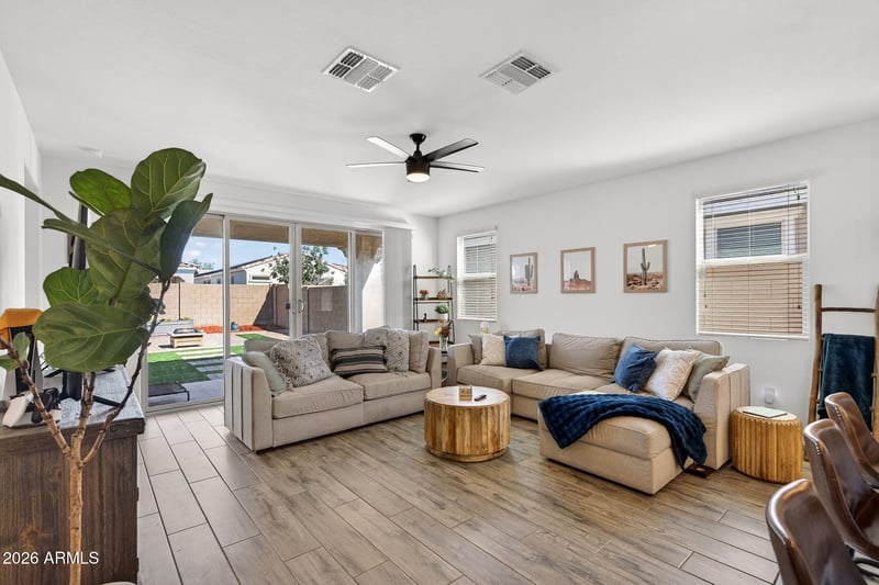Listing details for 9440 Willow Bend Ln, Phoenix, AZ 85037 : Beautifully maintained 3-bedroom, 2-bath home located in the gated Western Enclave community, built in 2019 and offering a modern single-level layout with thoughtful upgrades. The open floor plan features a spacious great room that flows into a beautifully designed kitchen with quartz countertops, a large island with seating, espresso cabinetry, stainless appliances, and a stylish tile backsplash. The layout is ideal for everyday living and entertaining. The split primary suite offers a walk-in closet, dual sinks, and a private bathroom. Two additional bedrooms provide flexibility for guests, family, or a home office. Step outside to a Beautifully designed backyard Featuring a paver patio area, artificial turf, and low-maintenance landscaping, creating a comfortable outdoor space perfect for or entertaining. Additional features include: " 2-car garage " tankless gas water heater " energy-efficient windows " no interior steps " gated community with playground and walking paths Conveniently located near Westgate Entertainment District, State Farm Stadium, Desert Diamond Arena, Tanger Outlets, and Loop 101, I-10, and the 202, providing easy access to shopping, dining, and entertainment throughout the Valley.