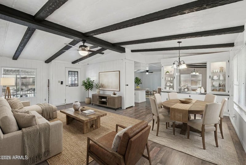 Listing details for 9501 Broadway Rd #57, Mesa, AZ 85208 : 55+ community, at least one occupant must be 55 years or older. This spacious corner-lot home offers a bright, open floor plan with vaulted ceilings in the family room, a formal dining room with built-in hutch, and a well-appointed kitchen with stainless steel appliances, a center island, and a cozy living room just off the kitchen. The generous main bedroom features an attached bath with walk-in shower and separate soaking tub, while the secondary bathroom includes a tub/shower combo. Recent updates include fresh interior and exterior paint, new flooring, new light fixtures and blinds, and a newer A/C and furnace. Outside you'll find a large covered patio with new railings, a storage shed, and a 2-car side-by-side carport, all in a well-maintained, active 55+ community.