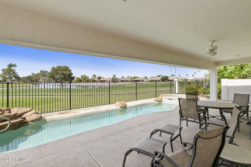 Listing details for 9505 Sunridge Dr, Sun Lakes, AZ 85248 : Spectacular golf, water and mountain views in this truly one-of-a kind 4BR, 4.5BA plus office Galleria model with a pool on the golf course in the highly desirable active adult community of Oakwood at Sun Lakes. Double doors greet you as you enter the light-filled great room with soaring ceilings and a gas fireplace. Bright kitchen with golf views, lots of cabinets and stone counters. Family room off the kitchen with entertainment wall and sliders to the fully covered south-facing patio. Heated pool with spa and water feature. Spacious primary suite with oversized his and hers walk-in closets and full bath with walk-in shower and dual sinks. All three guest suites include their own ensuite bathroom for maximum guest privacy. New roof in 2019, full 3 car garage. SEE MORE IronOaks has so many amenities including 45 holes of golf, tennis, pickleball, pools, fitness, restaurants, and countless clubs and activities.