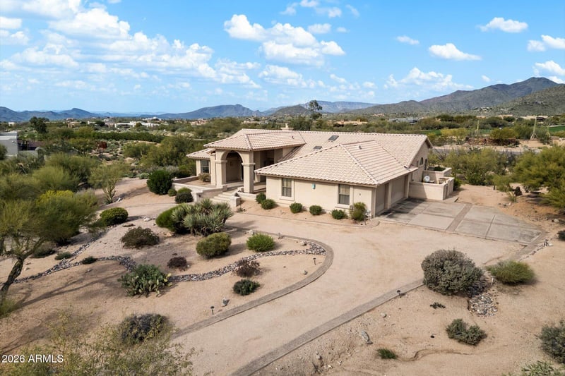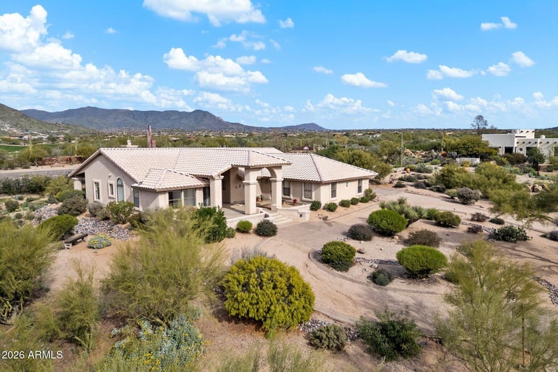 Listing details for 9520 Romping Rd, Carefree, AZ 85377 : This custom home sits on an elevated one-acre+ lot (el 2,712) capturing sweeping mountain views from the moment you step inside. Located in an upscale neighborhood surrounded by million-dollar homes, the setting offers privacy and room to add value—including plenty of space for a pool or guest house.