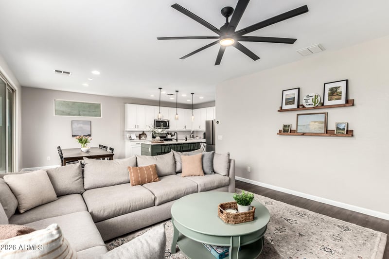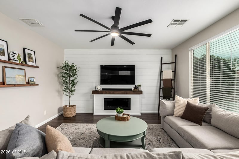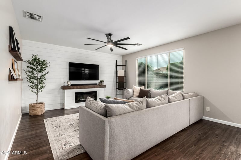Listing details for 9526 Thornbush Ave, Mesa, AZ 85212 : Better than new and move-in ready! This beautifully upgraded home features an open-concept layout connecting the kitchen, living, and dining areas—perfect for everyday living and entertaining. The kitchen offers upgraded trim and backsplash, plus a large walk-in pantry. Durable laminate flooring runs throughout the main level, complemented by a bonus room and powder room for added flexibility. The spacious family room showcases a custom electric built-in fireplace with an accent wall, adding warmth and personality. Upstairs, enjoy newer carpet, a huge loft, and generously sized bedrooms with walk-in closets. Fresh interior paint enhances the home's bright, clean feel. The backyard is fully finished with pavers and low-maintenance artificial turf—ideal for relaxing or entertaining year-round.