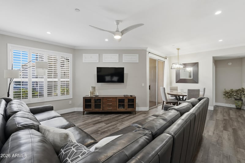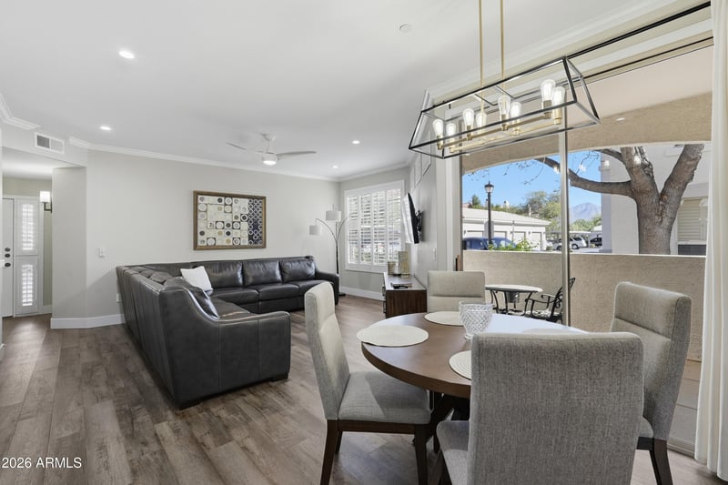 Listing details for 9550 Thunderbird Rd #127, Scottsdale, AZ 85260 : STUNNING CONDO! Updated ground level unit with rare direct access 2 car garage. This amazing unit is freshly remodeled with a beautiful kitchen featuring white shaker cabinets, matted stainless steel appliances, Quartz counter-tops with decorative tile backsplash, jet black plumbing fixtures, updated lighting, crown molding, Plantation shutters, fresh paint and carpet, wide plank LVP flooring, primary bathroom has dual sinks with Quartz countertops, spacious tile wrapped walk-in shower and much more. The location is ideal with shopping, award winning restaurants, hiking and golf all very close by. Units this nice and completely turn-key rarely come to market!