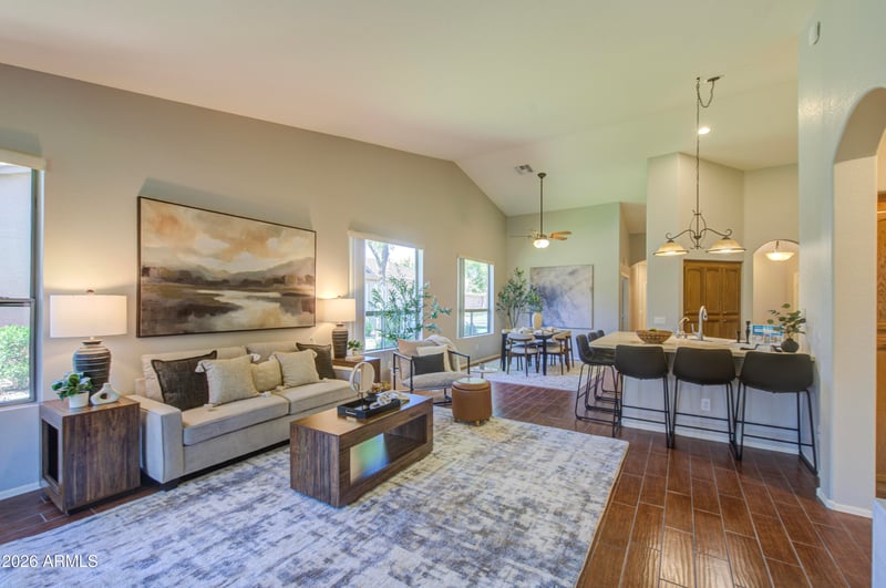 Listing details for 9621 Arrowvale Dr, Sun Lakes, AZ 85248 : New budget friendly price! This is move in ready! The Naples is a thoughtfully designed home with a gourmet kitchen featuring granite counters, gas stove with double oven, pull-out shelving, and included LG Instaview refrigerator, washer, and dryer, . Wood-look tile floors, tinted windows, fresh paint, an upgraded shower, and a new (2024) roof add comfort and peace of mind. The back patio has been extended so it's easy to entertain indoors and out! Just steps away from the clubhouse path!