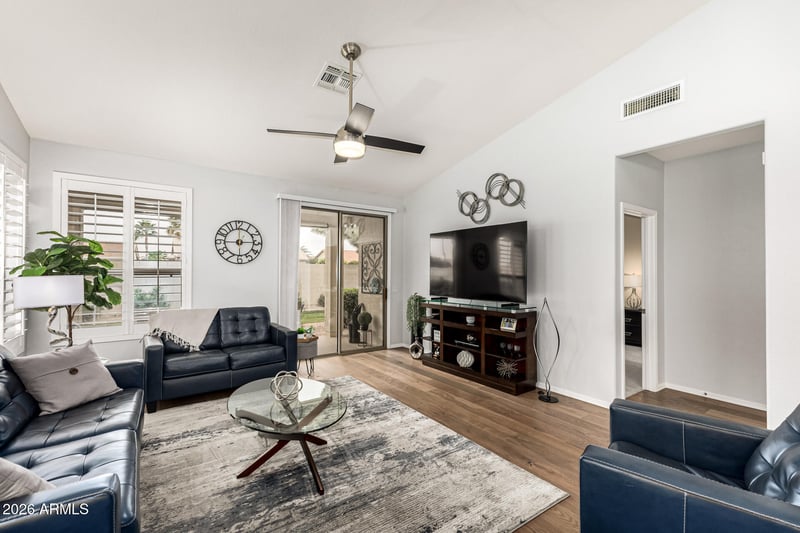Listing details for 9625 Holiday Way, Sun Lakes, AZ 85248 : New Roof underlayment and gutters in 2025! Experience resort-style living in the desirable 55+ Sun Lakes community! This beautifully maintained 2‑bed, 2‑bath home offers charming curb appeal, mature landscaping, and a 2‑car garage with built‑in storage. Inside, enjoy plantation shutters, vaulted ceilings, abundant natural light, real wood flooring in main areas, and plush bedroom carpet. The open layout features a stunning kitchen with stainless appliances, quartz counters, designer backsplash, and a cozy breakfast nook. The spacious primary suite includes dual quartz vanities and a walk‑in closet. Relax on the covered patio overlooking a lush greenbelt with exceptional community amenities nearby. PLUS! Sun Lakes provides a wide range of resort-style amenities, including golf courses, tennis & pickleball courts, heated pools, fitness centers, and scenic walking paths. Residents also enjoy elegant clubhouses, on-site dining, hobby rooms, and a full calendar of clubs, classes, & social events. All these features come together to create an active, vibrant lifestyle in a beautifully maintained community. Don't miss this opportunity!