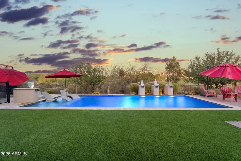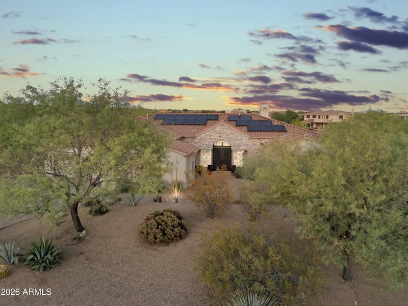 Listing details for 9799 Jagged Peak Rd, Scottsdale, AZ 85262 : Located in the highly sought-after community of Sierra Norte, this immaculately maintained 4,322 SF home sits on a private 0.9-acre corner lot with desirable east-facing backyard exposure and NAOS behind. Offering 5 bedrooms and 5 bathrooms in a well-designed split floor plan, this home blends functionality with elevated desert living. The kitchen is equipped with granite countertops, a Sub-Zero refrigerator, Dacor range with ovens, hood, and microwave, and an oversized walk-in pantry, making it ideal for both everyday living and entertaining. The spacious primary suite features a sitting area and dual closets, creating a comfortable and private retreat. Thoughtful upgrades throughout include wood-look tile in the main living areas, designer lighting, a custom entertainment center with stacked stone fireplace, floating shelves and built-ins, and a custom iron front door. Step outside to a resort-style backyard complete with a saltwater pool, extended paver patio, putting green, and turf, all designed to maximize outdoor enjoyment. Recent improvements, including removal of dead trees, enhance the natural beauty and usability of the lot while still maintaining the privacy and character of the surrounding desert landscape. Additional features include an epoxied garage floor with built-in cabinets, owned solar with 42 panels, updated HVAC, and numerous system upgrades that contribute to the home's efficiency and long-term value. This is a rare opportunity to own a thoughtfully upgraded home on nearly an acre in one of North Scottsdale's most desirable communities.